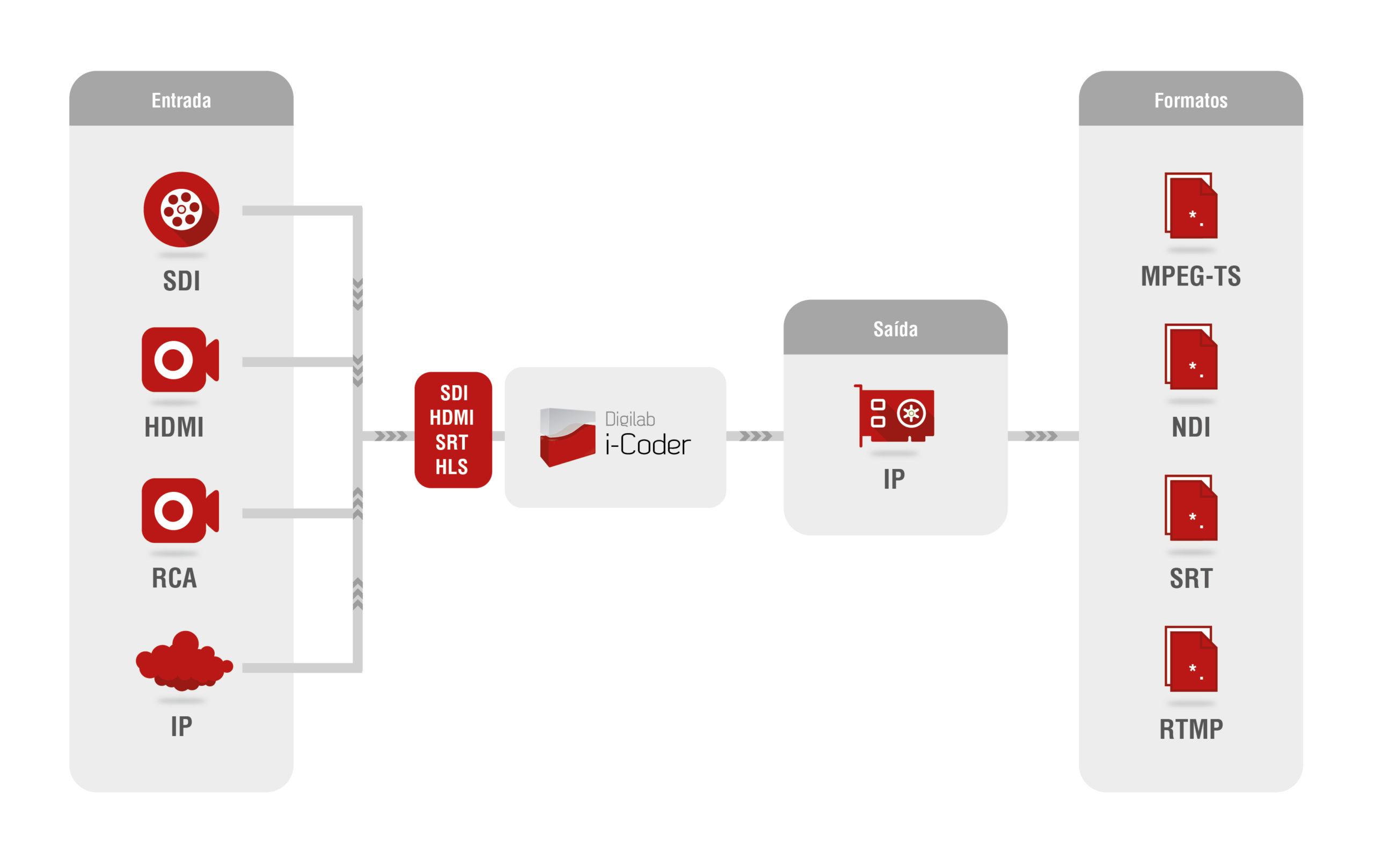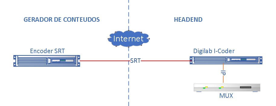 O Digilab I-coder recebe o sinal SRT no headend através de uma interfase de rede exclusiva e faz o encoding em MPEG-TS em SD e HD por outra placa adicionando os Pids e parâmetros necessários para o Mux da operadora.
